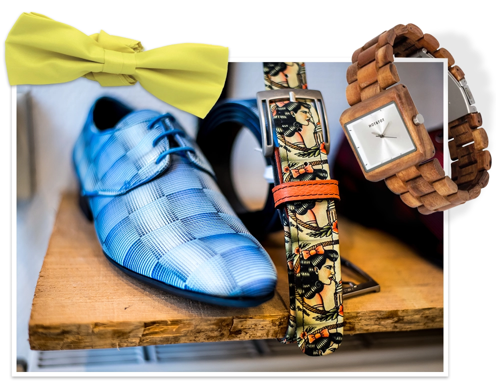 We helpen je om je maatkostuum te voorzien van passende accessoires. Denk aan een stropdas, bretels en manchetknopen, riem en schoenen.
