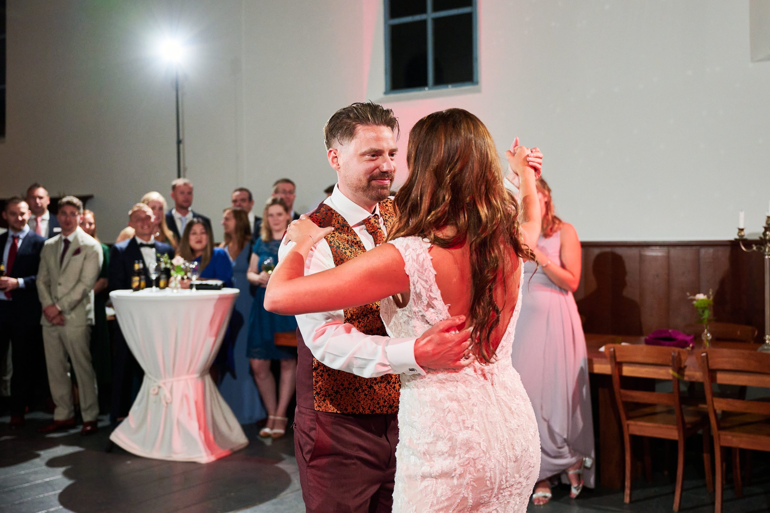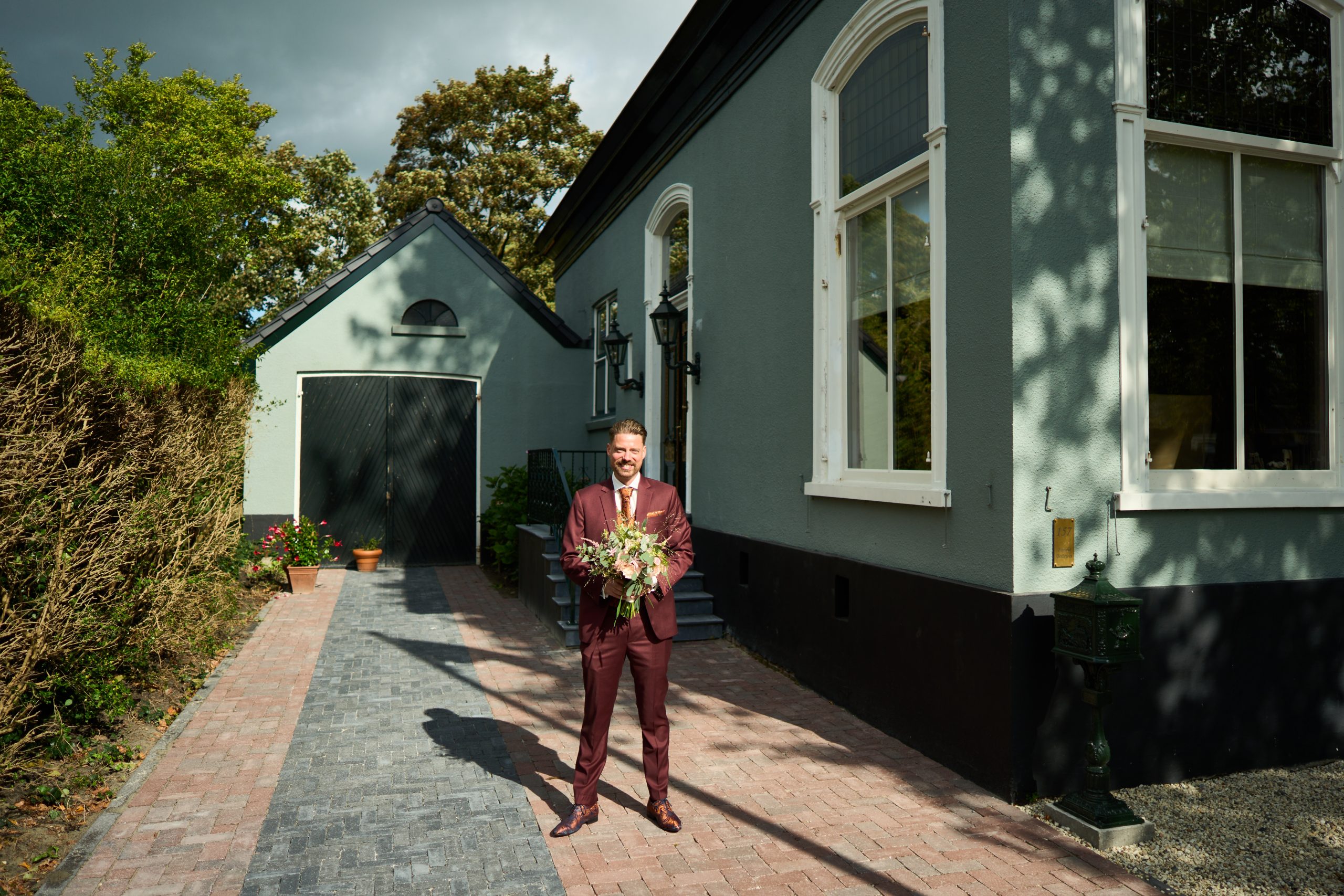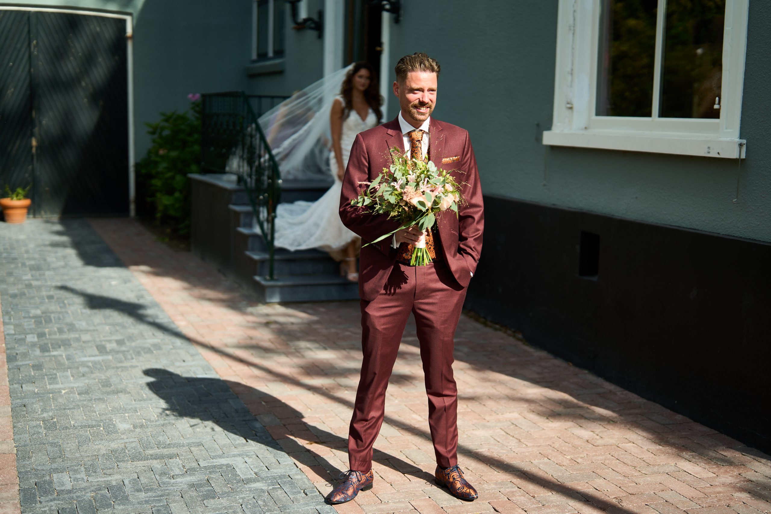 Rémon zou gaan trouwen met Laura, en kwam naar De Stijlmeester voor een trouwpak. Hij had nooit gedacht dat hij op een pak in deze rode kleur zou uitkomen. Maar toen Rémon voor de uitzoek- en aanmeetsessie in onze winkel kwam, trok een voorbeeldkostuum in de kleur rood meteen zijn aandacht. Hij vond het mooi, en de gasten die hij had meegevraagd vonden dat ook. Al bladerend en pratend, kijkend en vergelijkend koos hij dus voor een bordeaux rode stof. En als je de stralende foto’s ziet, is het alsof hij nooit een andere kleur heeft gedragen.