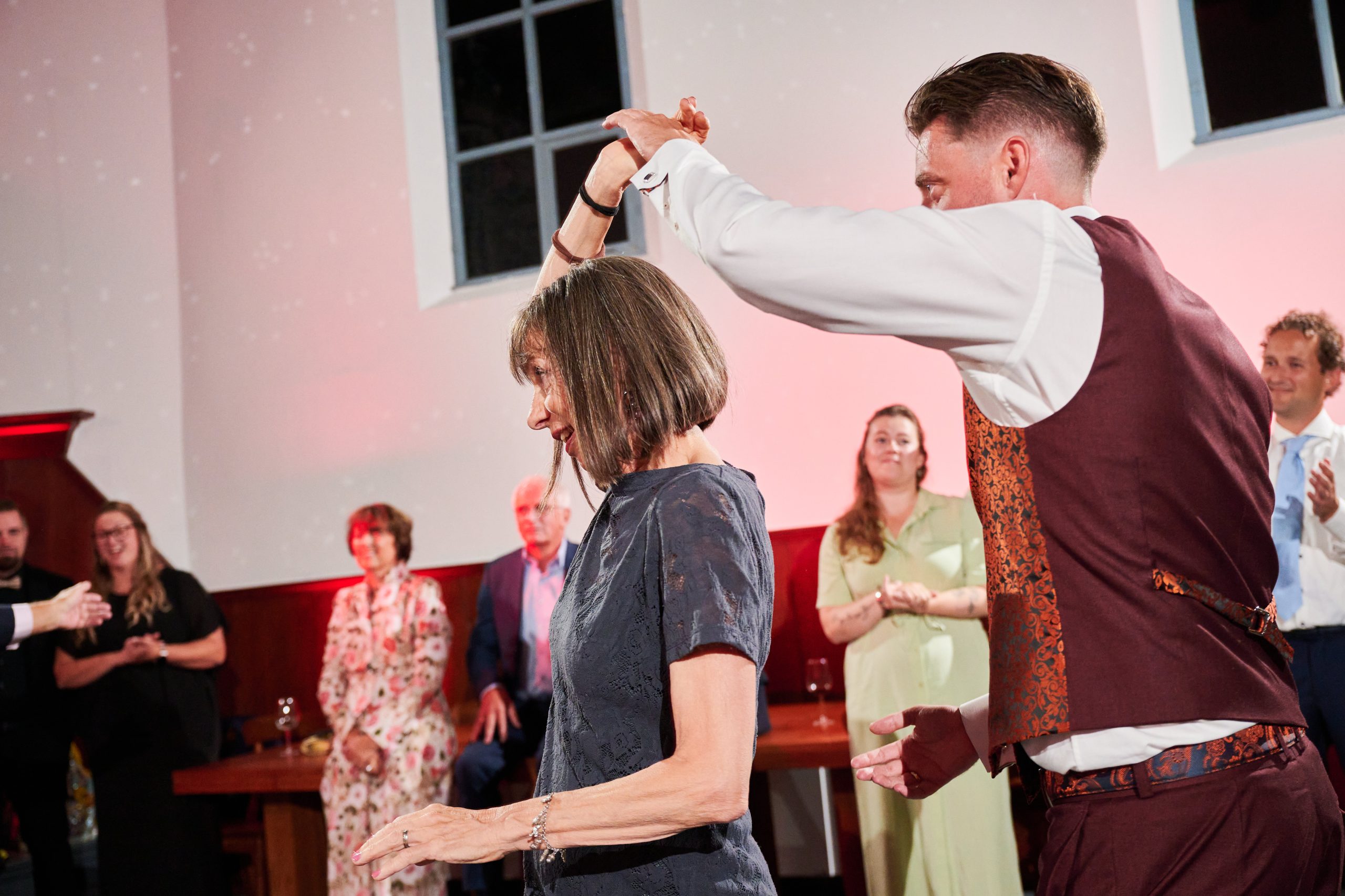 Toen Rémon de bordeaux rode kleur voor zijn trouwkostuum had gekozen, was het tijd voor de volgende stap: het gilet, de afwerking en de details. Met hulp van ons advies kwam hij uit bij een gilet in oranje/koperkleurige jacquardstof. Het riempje aan de achterkant matchend, de stropdas ook. De stiksels van het jasje zijn in dezelfde kleur. Vroeger had dat niet gekund, weet je nog, oranje en rood combineren. Maar kijk eens hoe mooi het is. Fijn dat je bij ons niet aan de regels van de modepolitie vastzit.