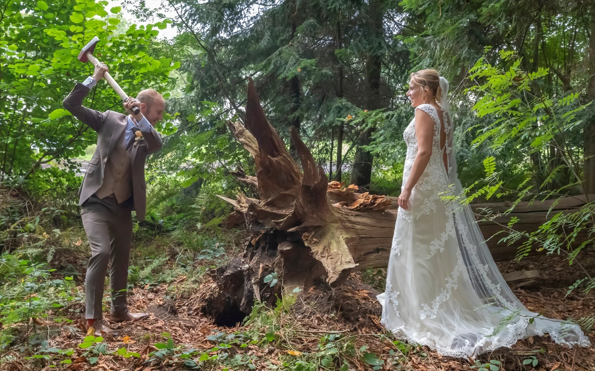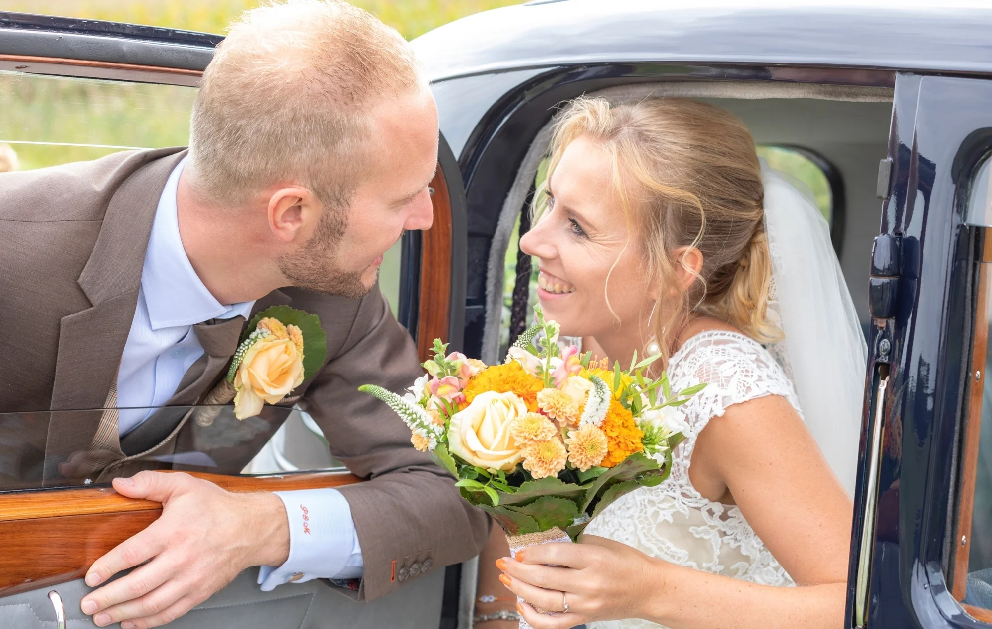 Bruin maatpak met themakleur bruiloft oranje
