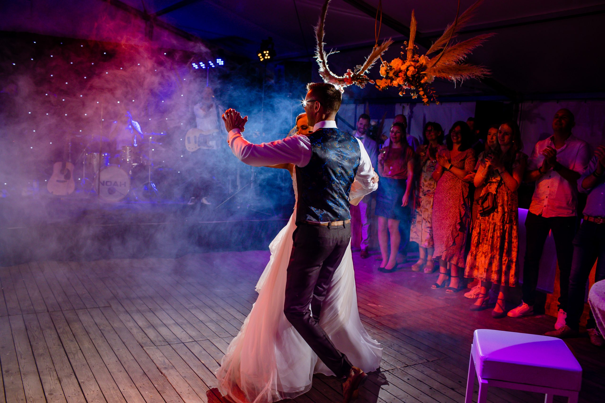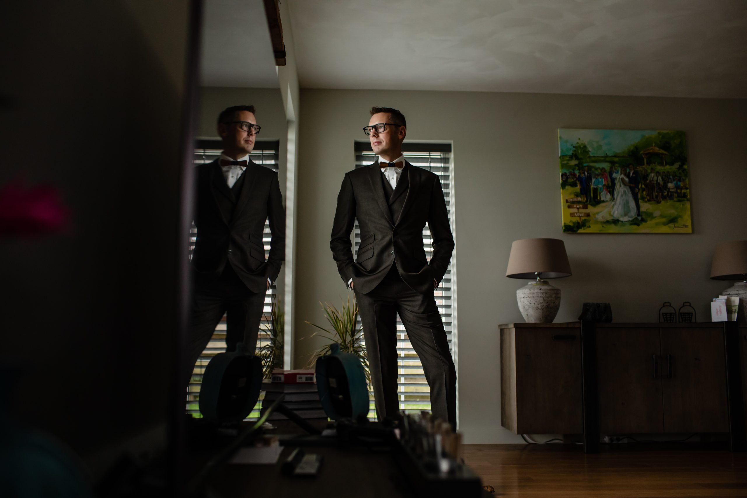 Bruidegom Sven koos een bruin trouwpak, en een voeringstof met kleurrijke pauwenveren voor in het jasje. We lieten het vestje op de achterkant weer in dezelfde stof maken. Tot in de kleinste details doorgevoerd: ook de houten vlinderdas werd omhuld met die stof. Alles voor een harmonieus geheel.
