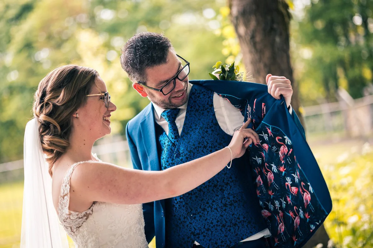 Een blauw trouwpak, jacquard en flamingo’s