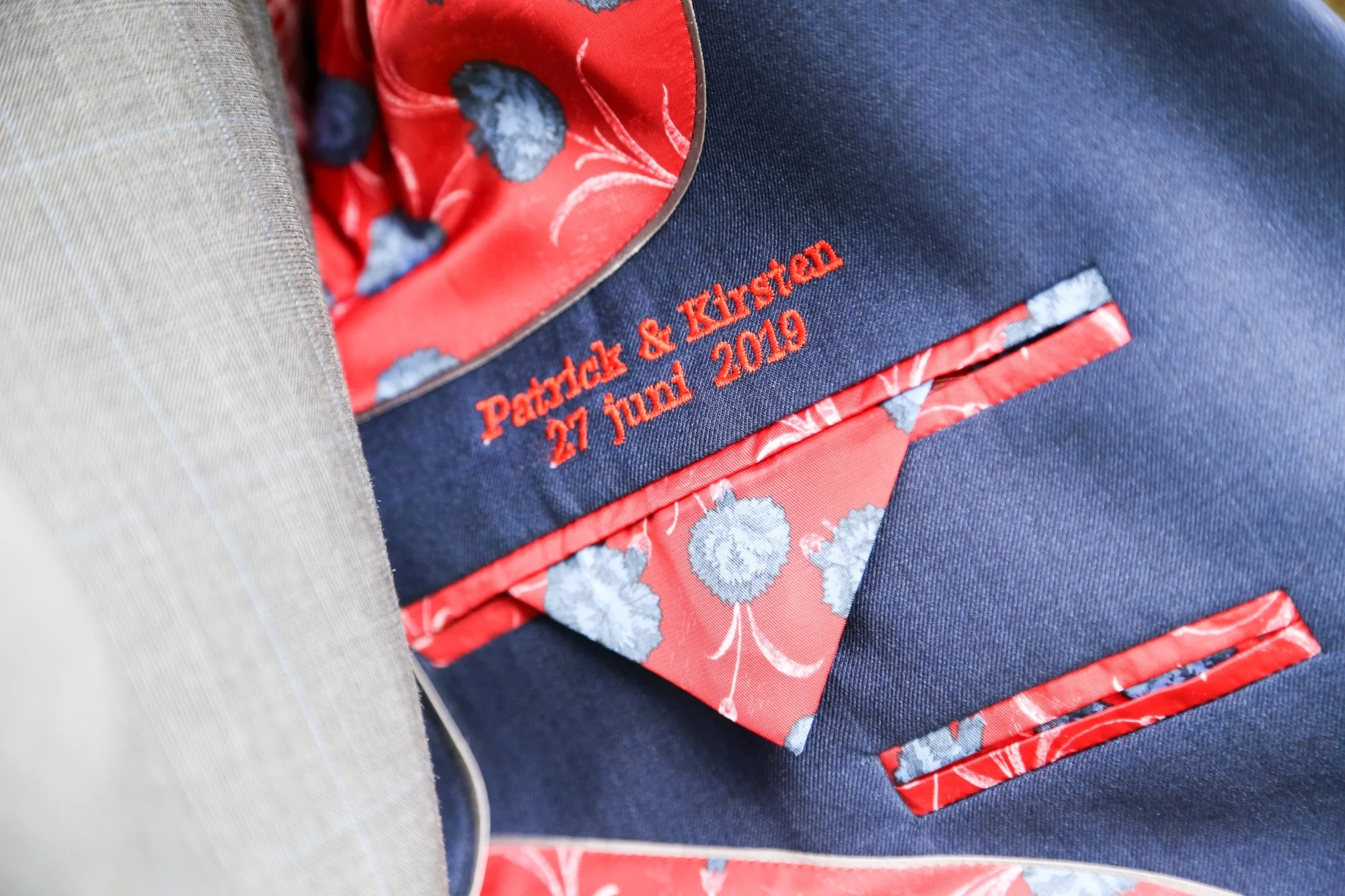 Een combinatie maatkostuum blauw grijs met rode details