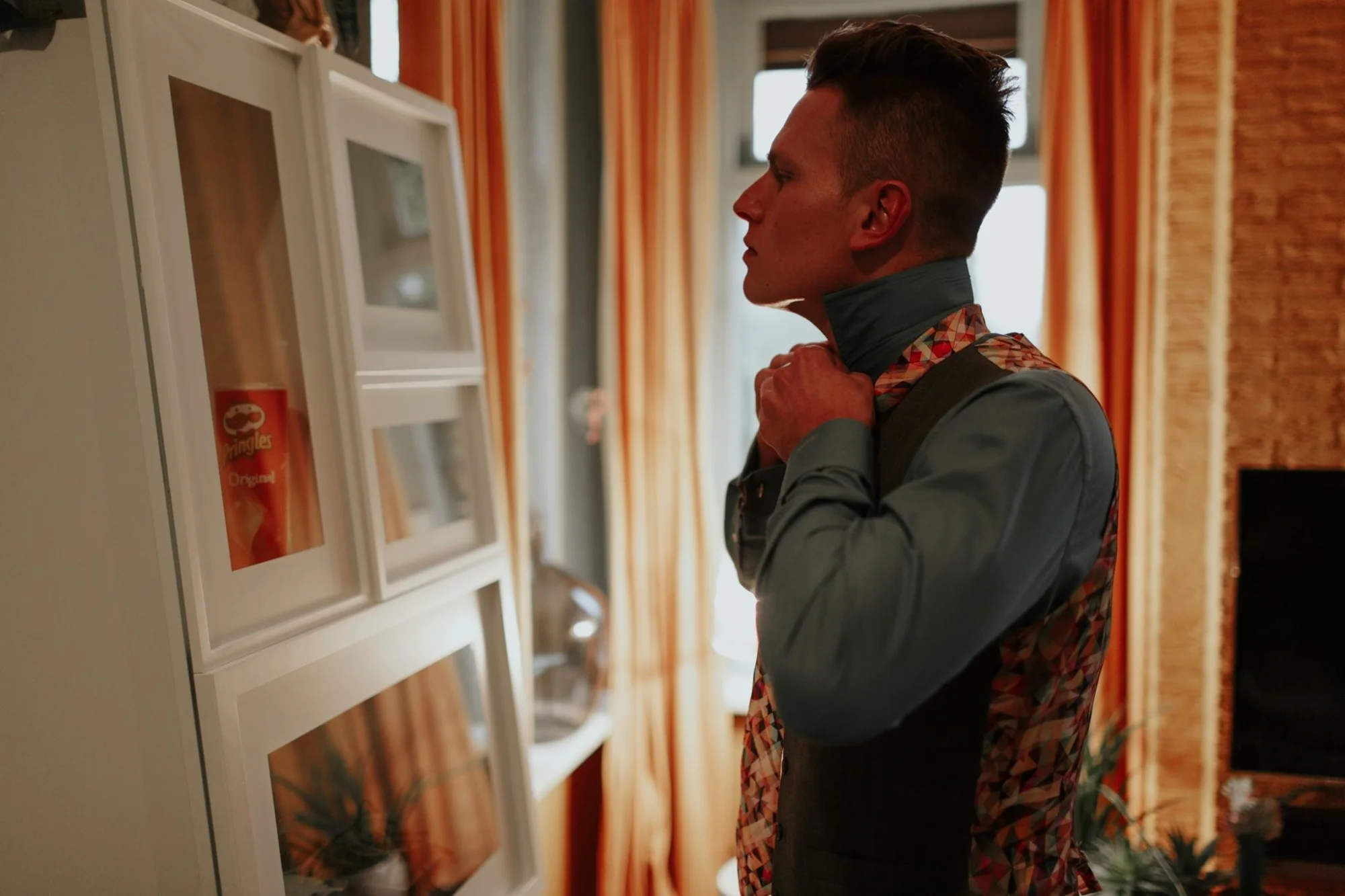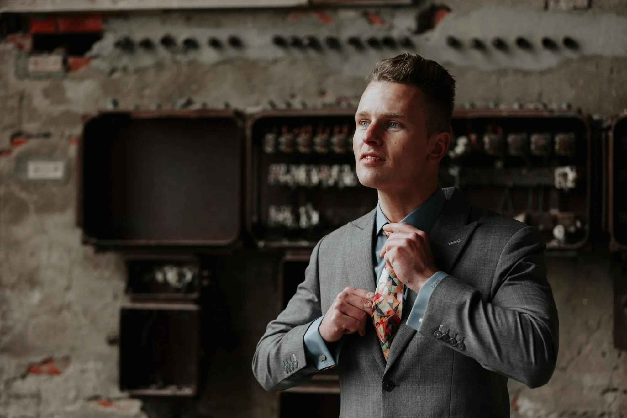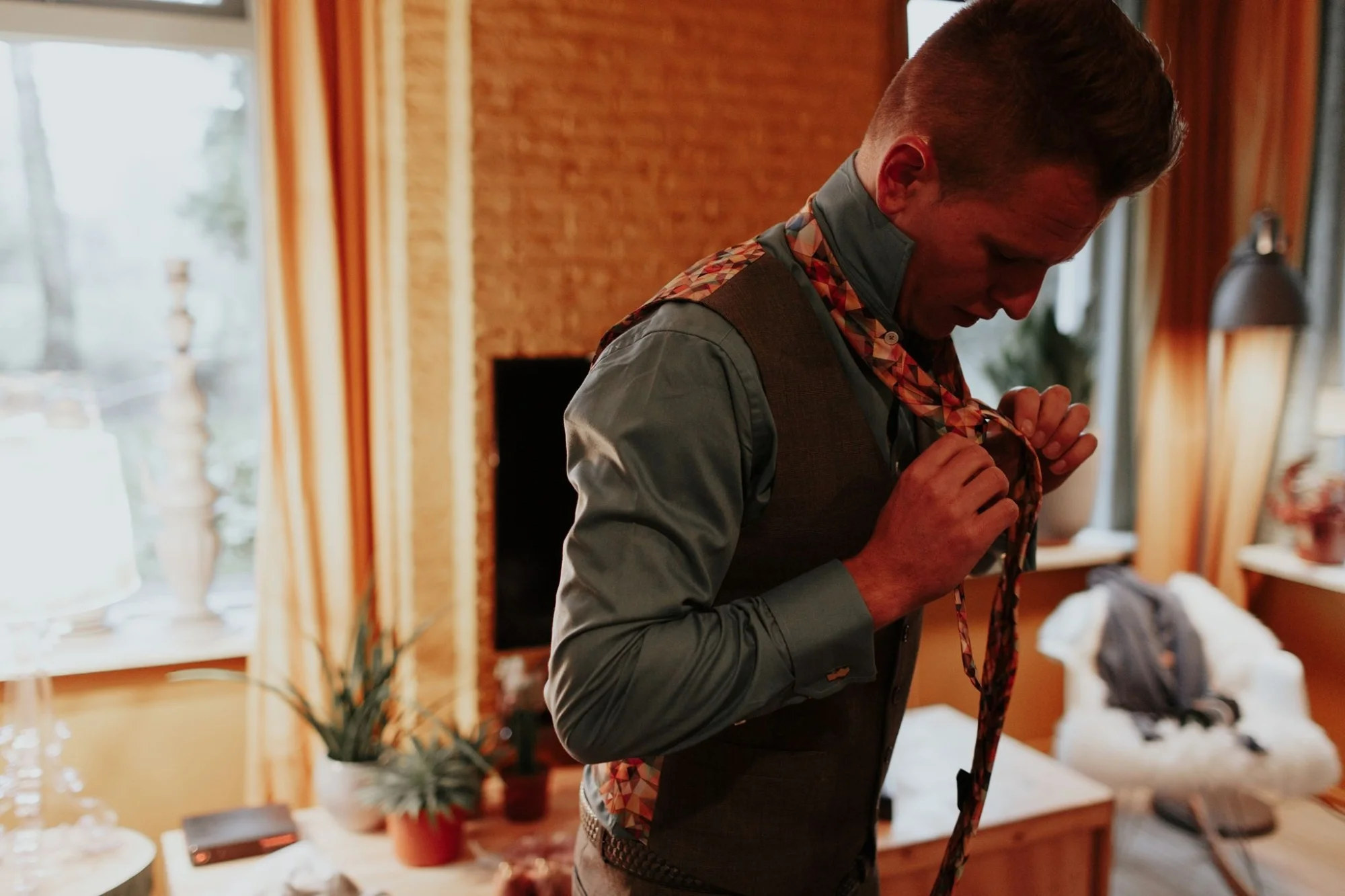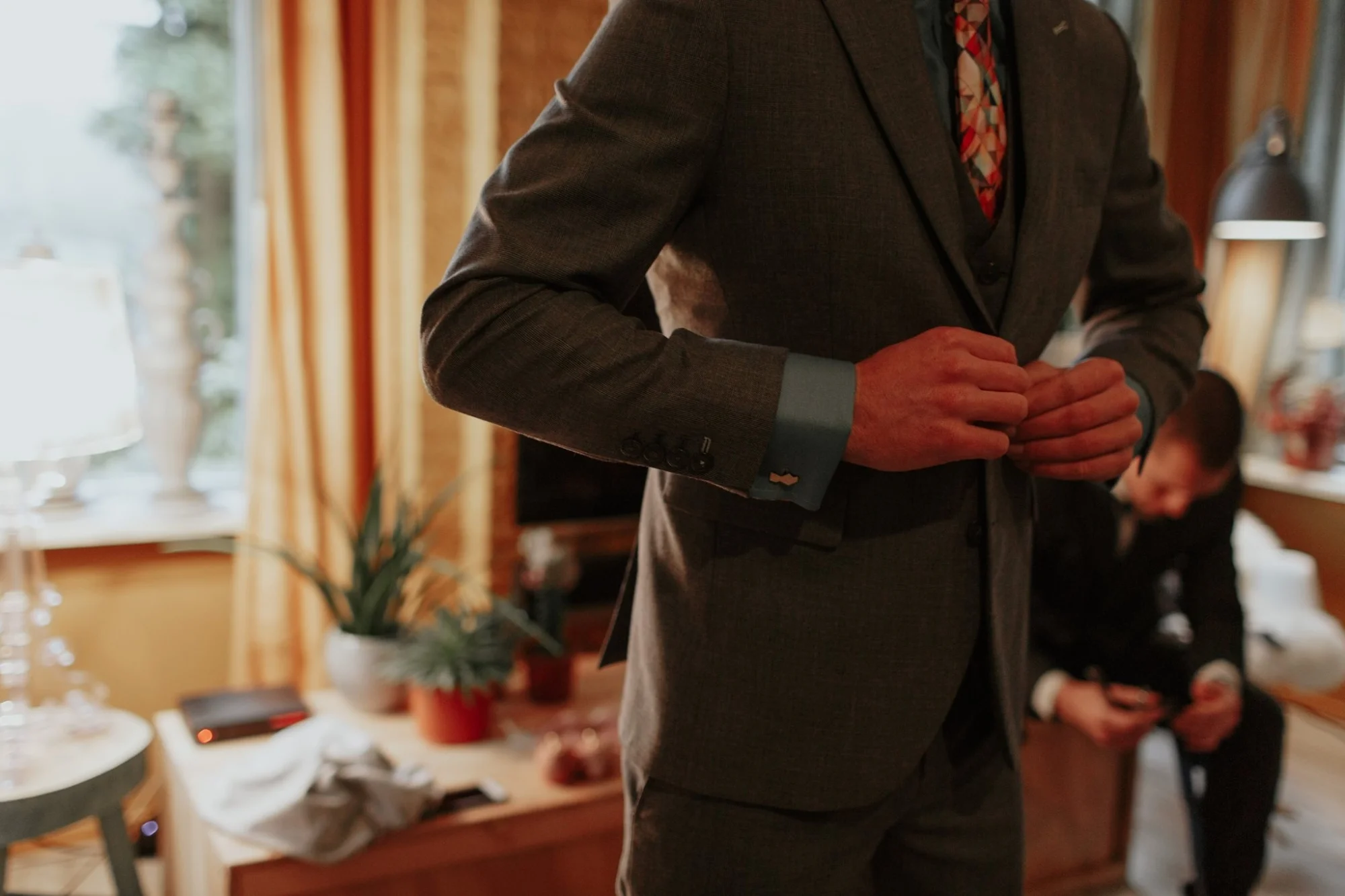 Een glencheck grijs trouwpak vol kleuren