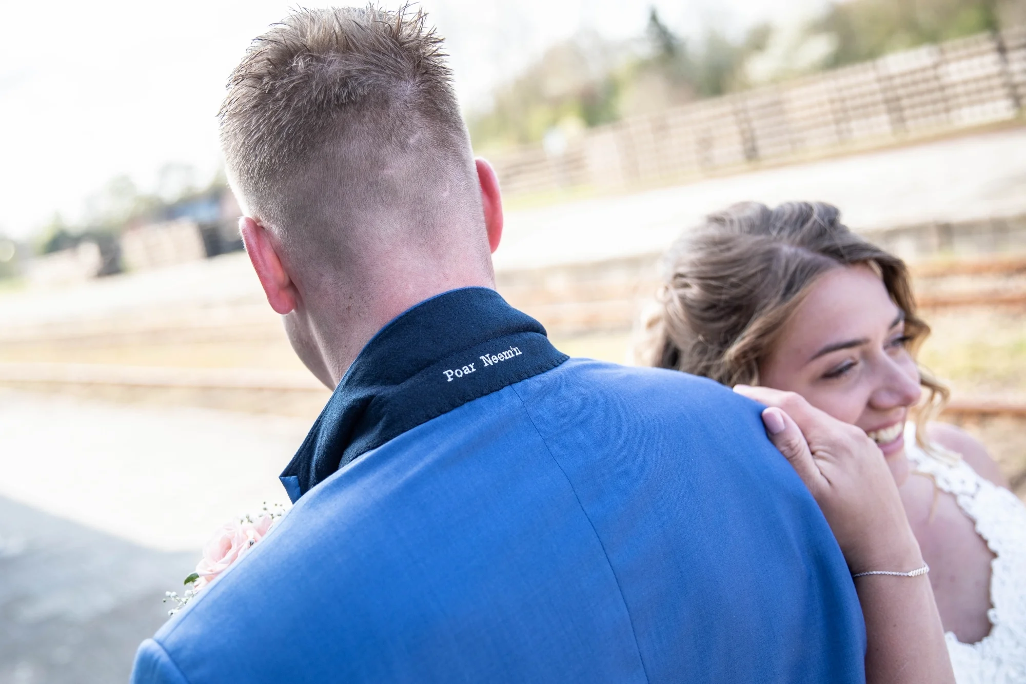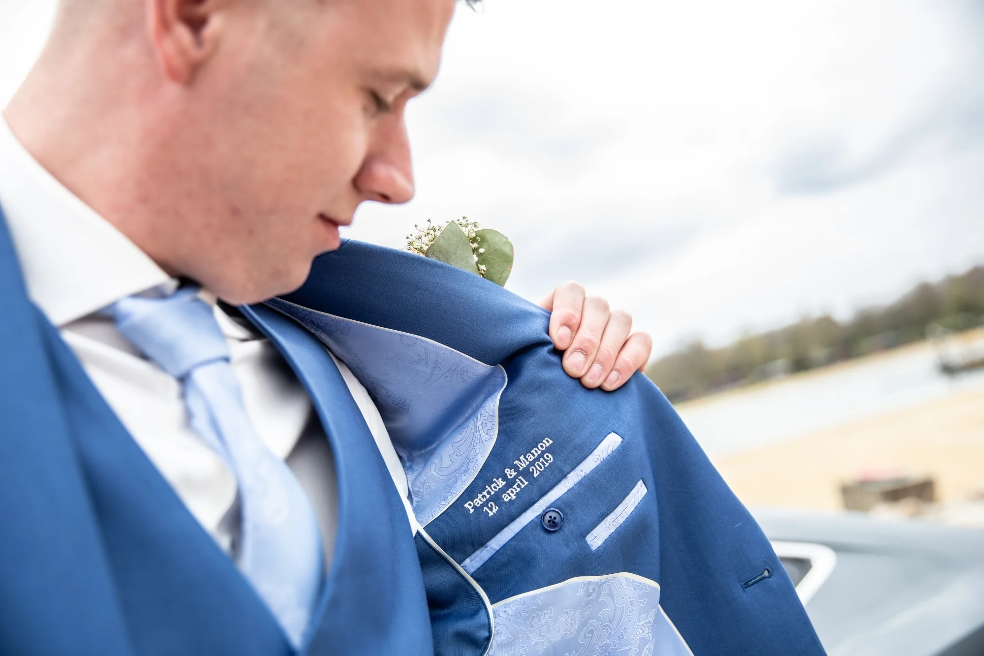 Je kunt je persoonlijke tekst, of zelfs een afbeelding, laten borduren in je trouwkostuum. Maak het zo nog specialer.