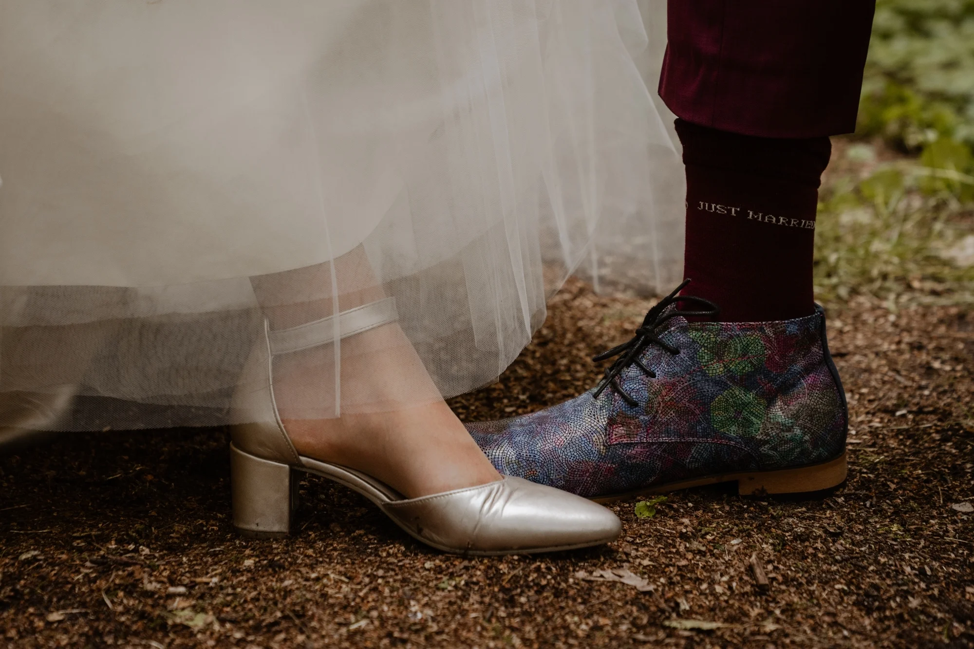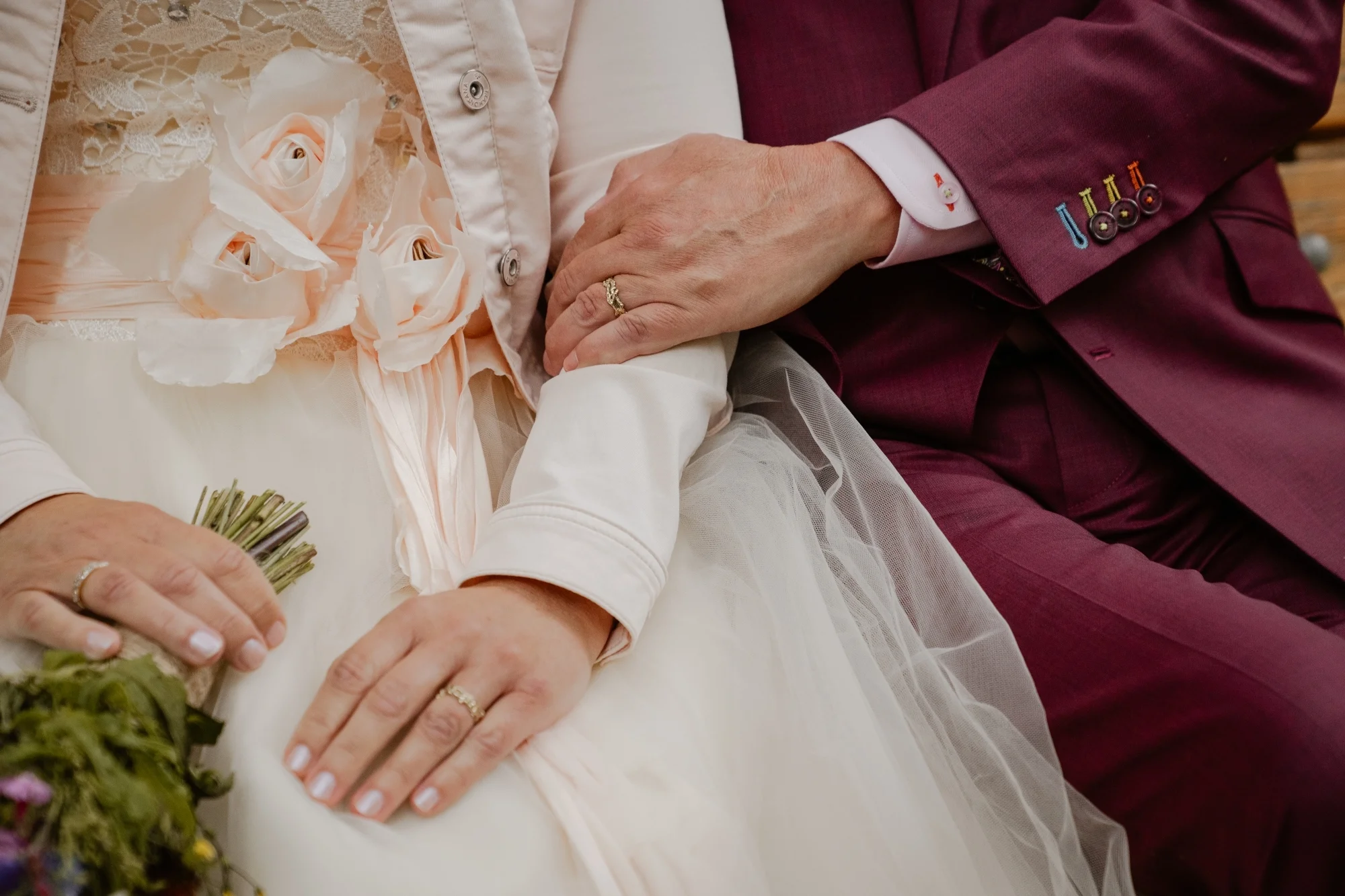 Een rood trouwpak met kleurrijke details