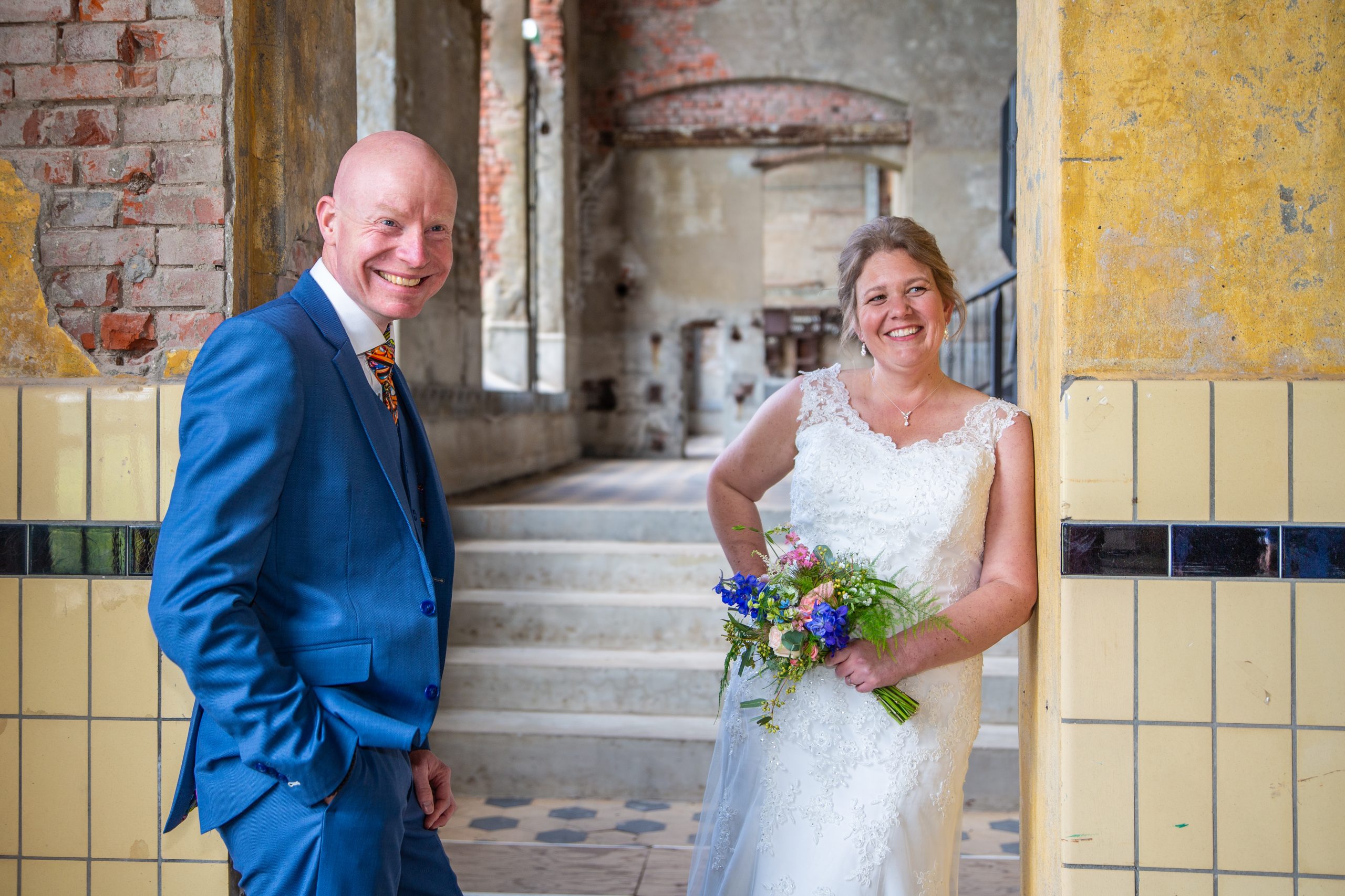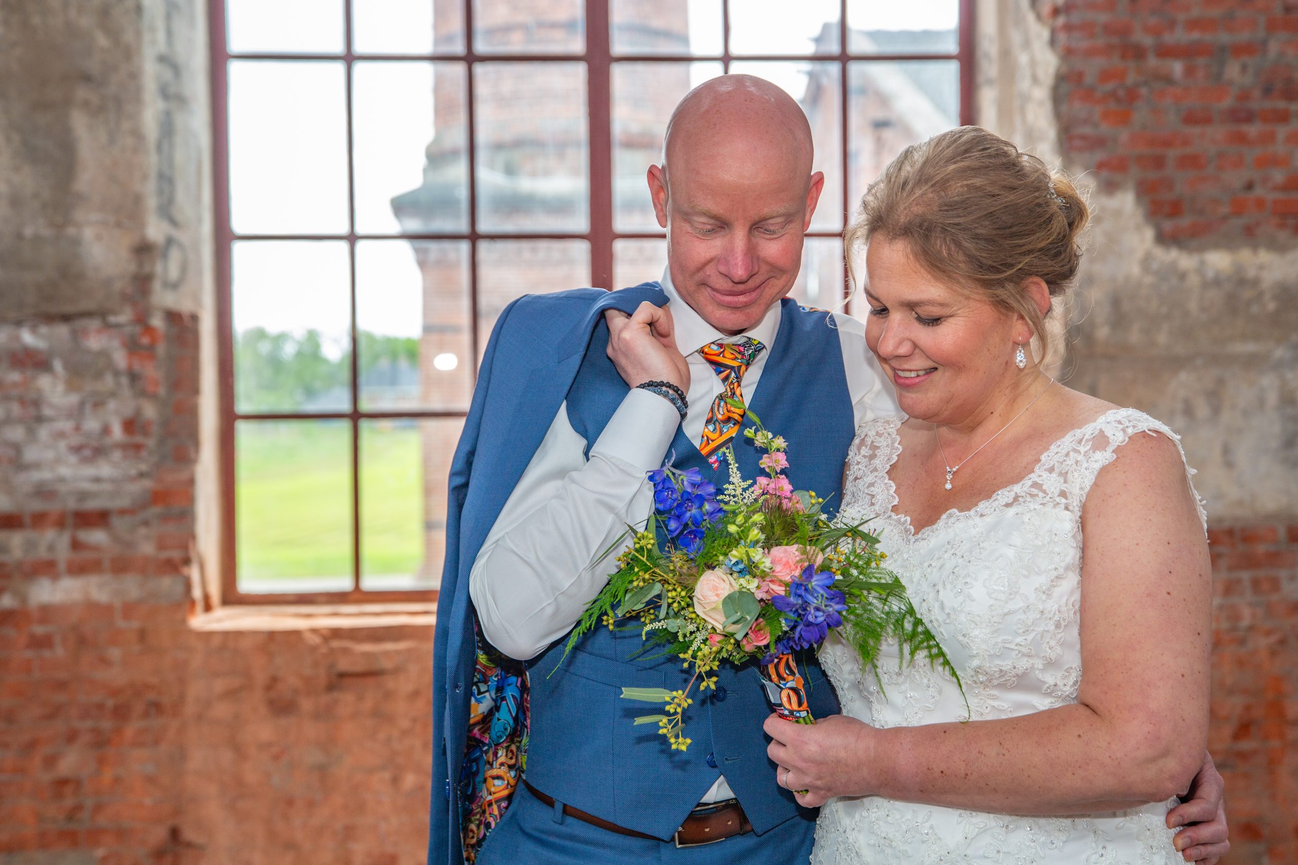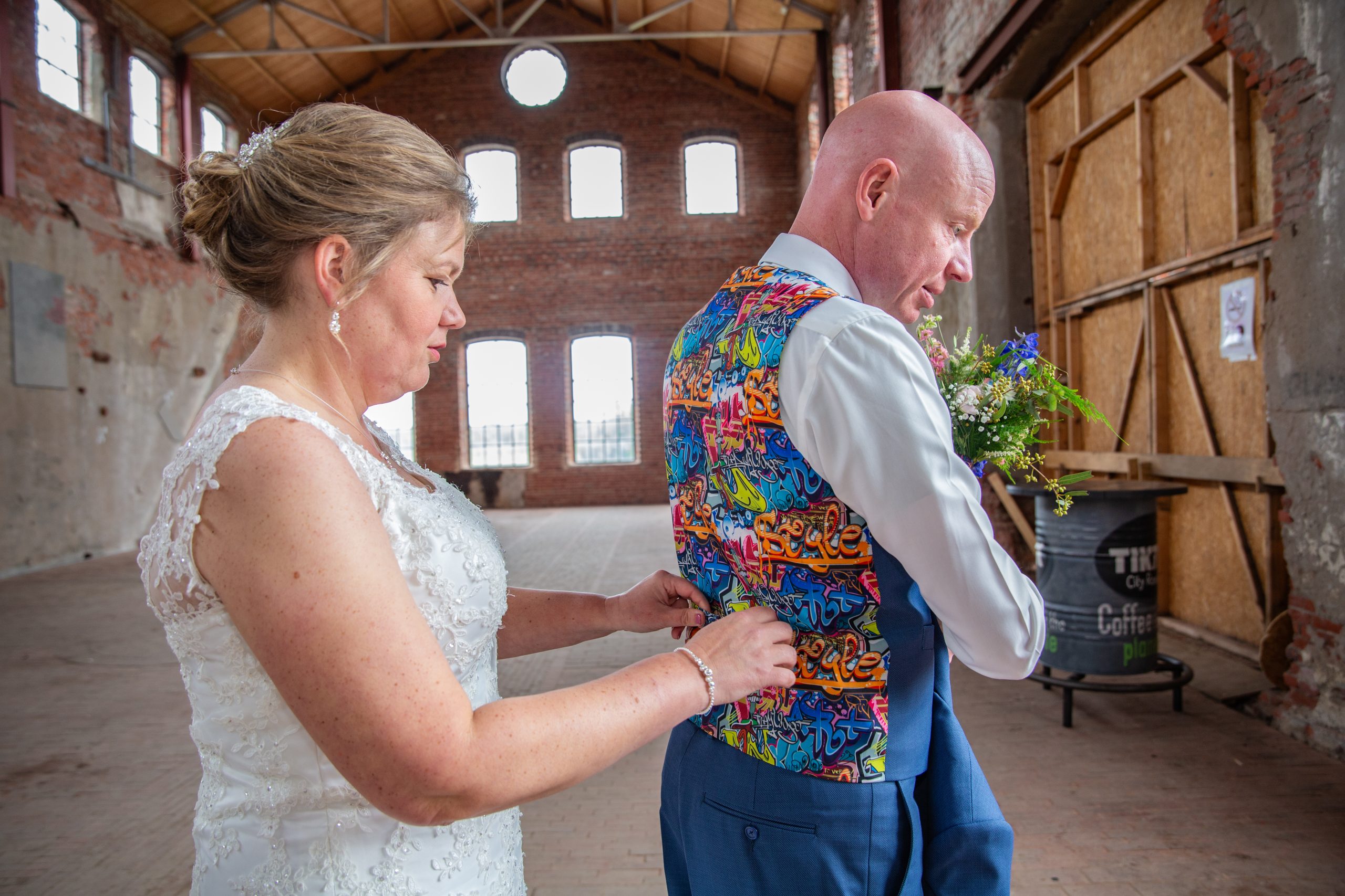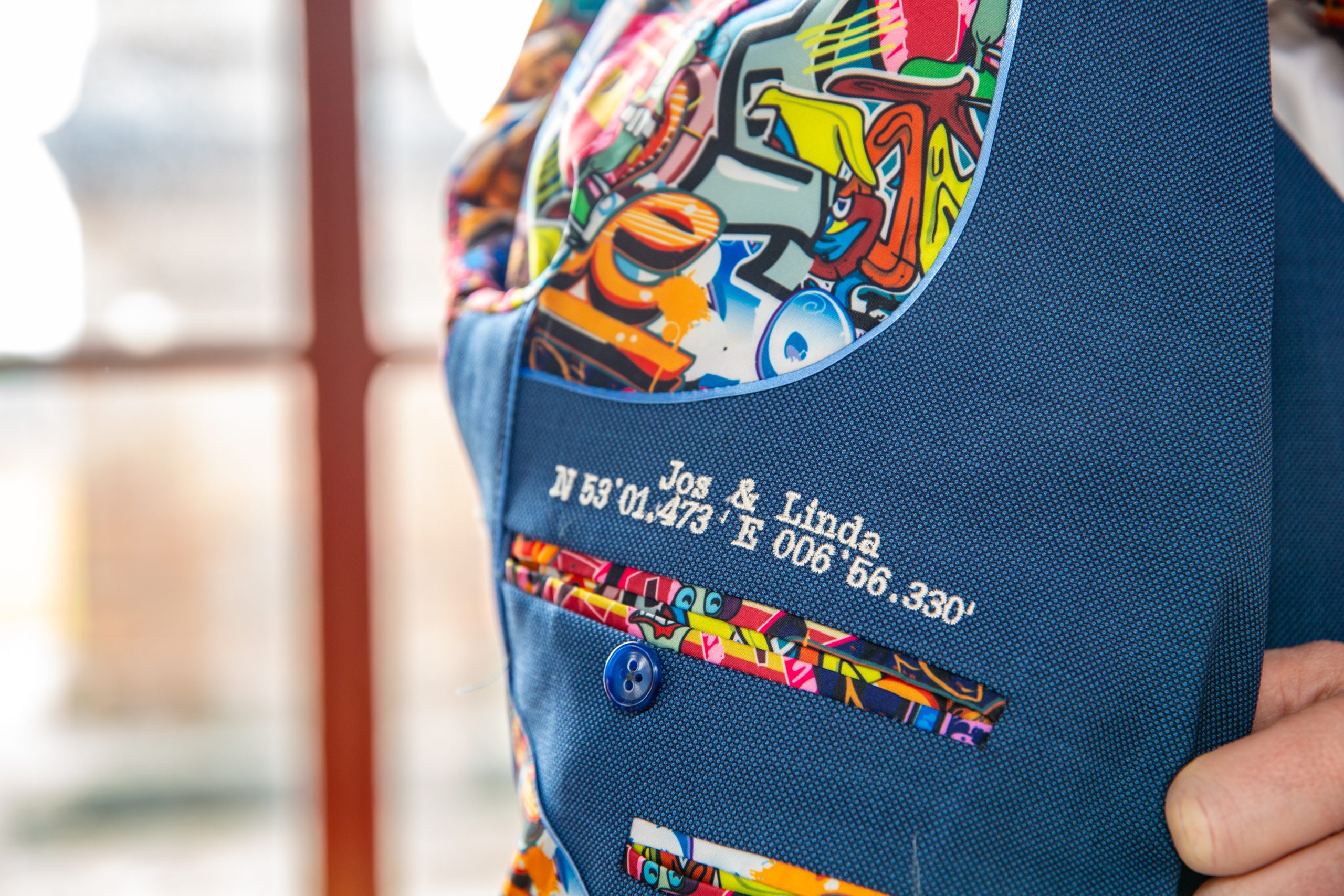 Bruidegom Jos koos een blauw trouwpak, en een voeringstof met een kleurrijke print voor in het jasje. We lieten het vestje op de achterkant en de stropdas weer in dezelfde stof maken, alles in ‘Style’.