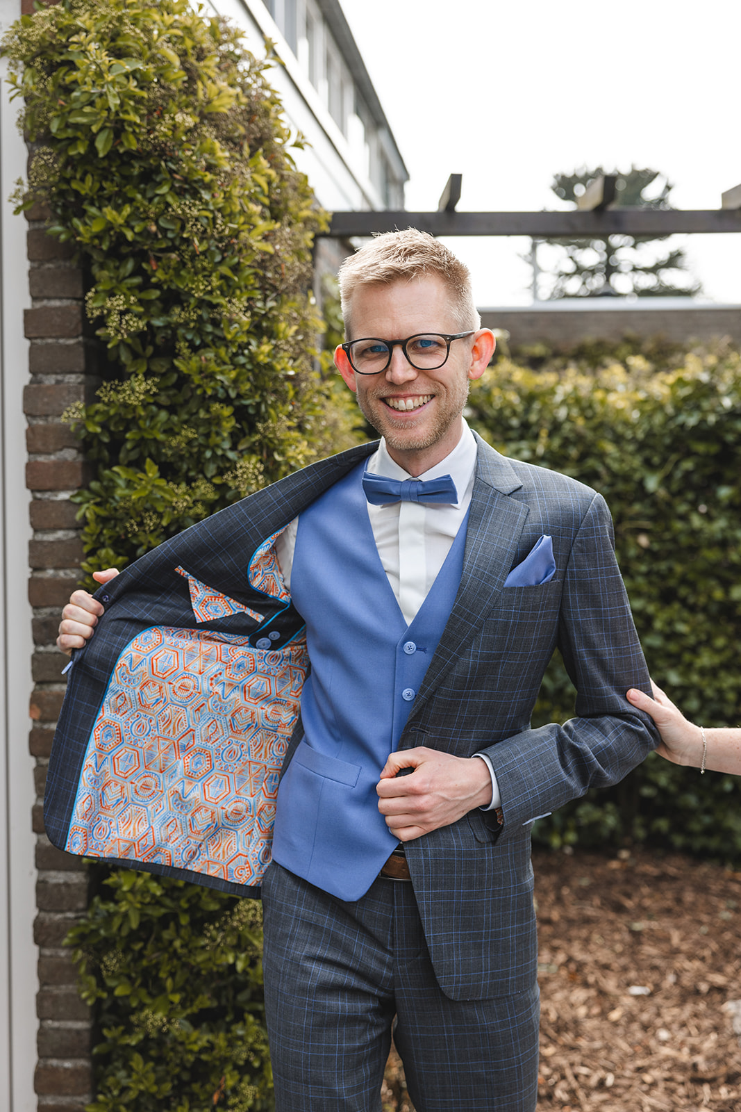 Je hebt ze niet voor niets gevraagd: je getuigen staan dicht bij je. Misschien wil je dat wel laten zien door ze passende kleding te laten dragen. Een maatkostuum dat bij het jouwe past, of een terugkerend detail (voering, knopen, vestje, das) dat op jullie bijzondere connectie wijst. We lieten twee extra vlinderstrikken met bijpassende pochets in dezelfde stof maken.