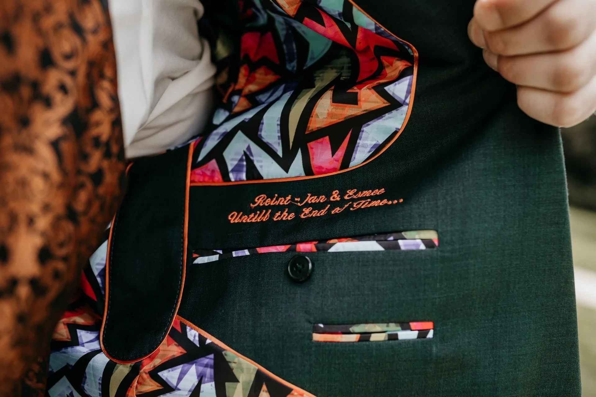 Bruidegom Reint-jan koos een groen trouwpak, met een vestje in chique oranje jacquardstof op de voorkant. We lieten de stropdas weer in dezelfde stof maken, alles voor de mooiste match.