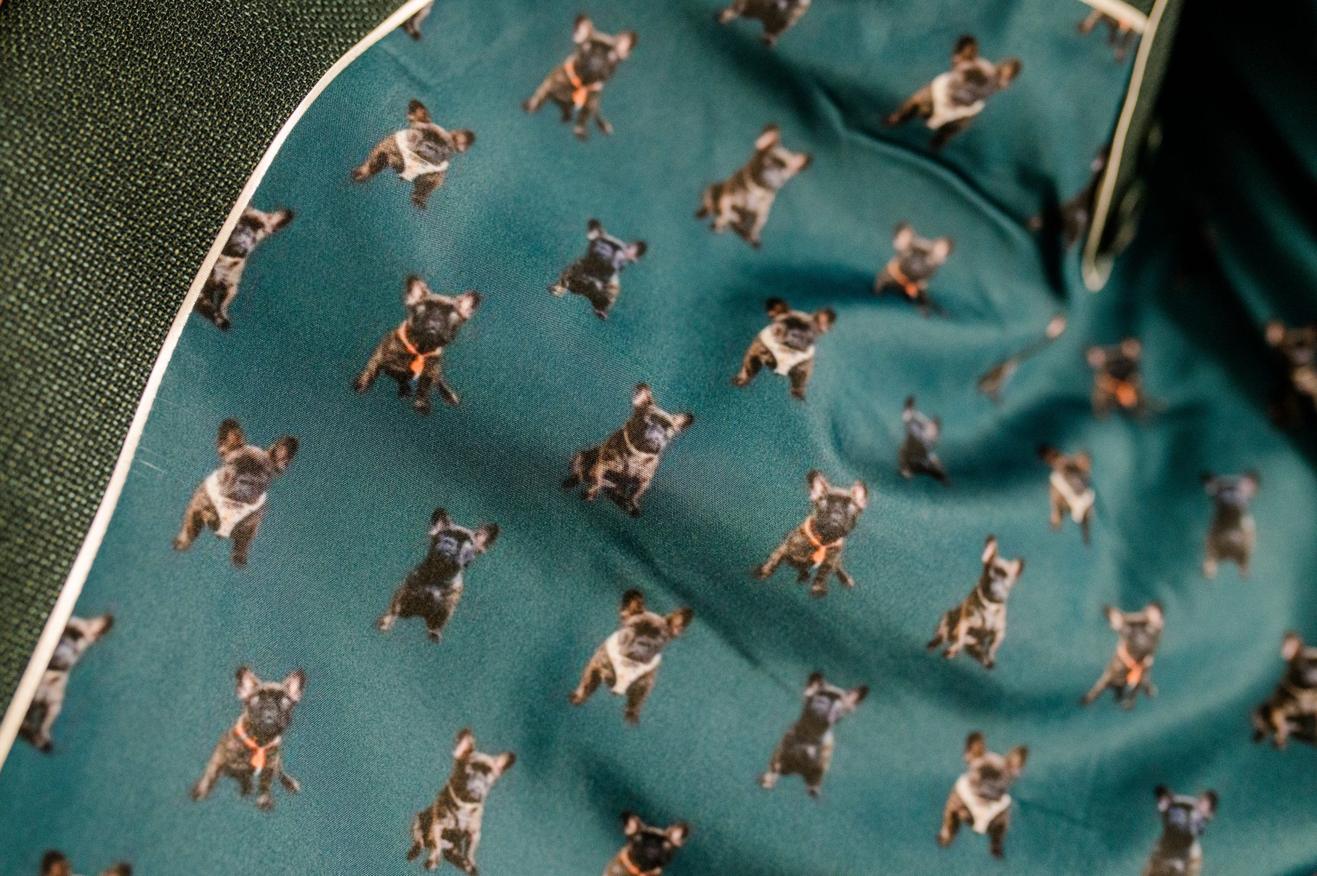 Richard maakte dankbaar gebruik van de mogelijkheid om de voeringstof te laten bedrukken met een eigen afbeelding. De ogen van Evelien schitterden toen ze verrast zag wat hij erop had laten drukken: afbeeldingen van hun lieve hondje Guus. Stel je eens voor wat jij als custom afbeelding op jouw voering zou zetten? Want je pak 100% uniek maken, doe je bij De Stijlmeester.