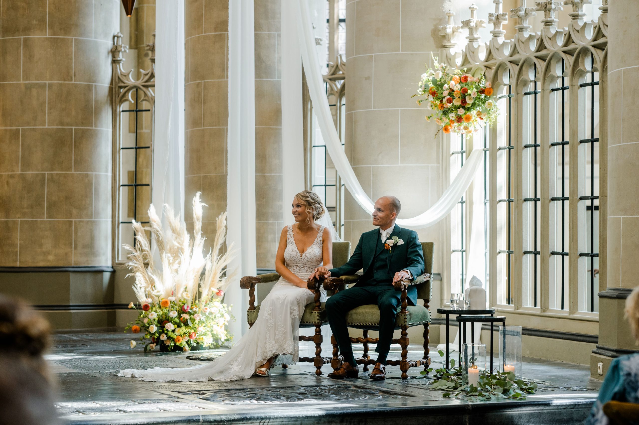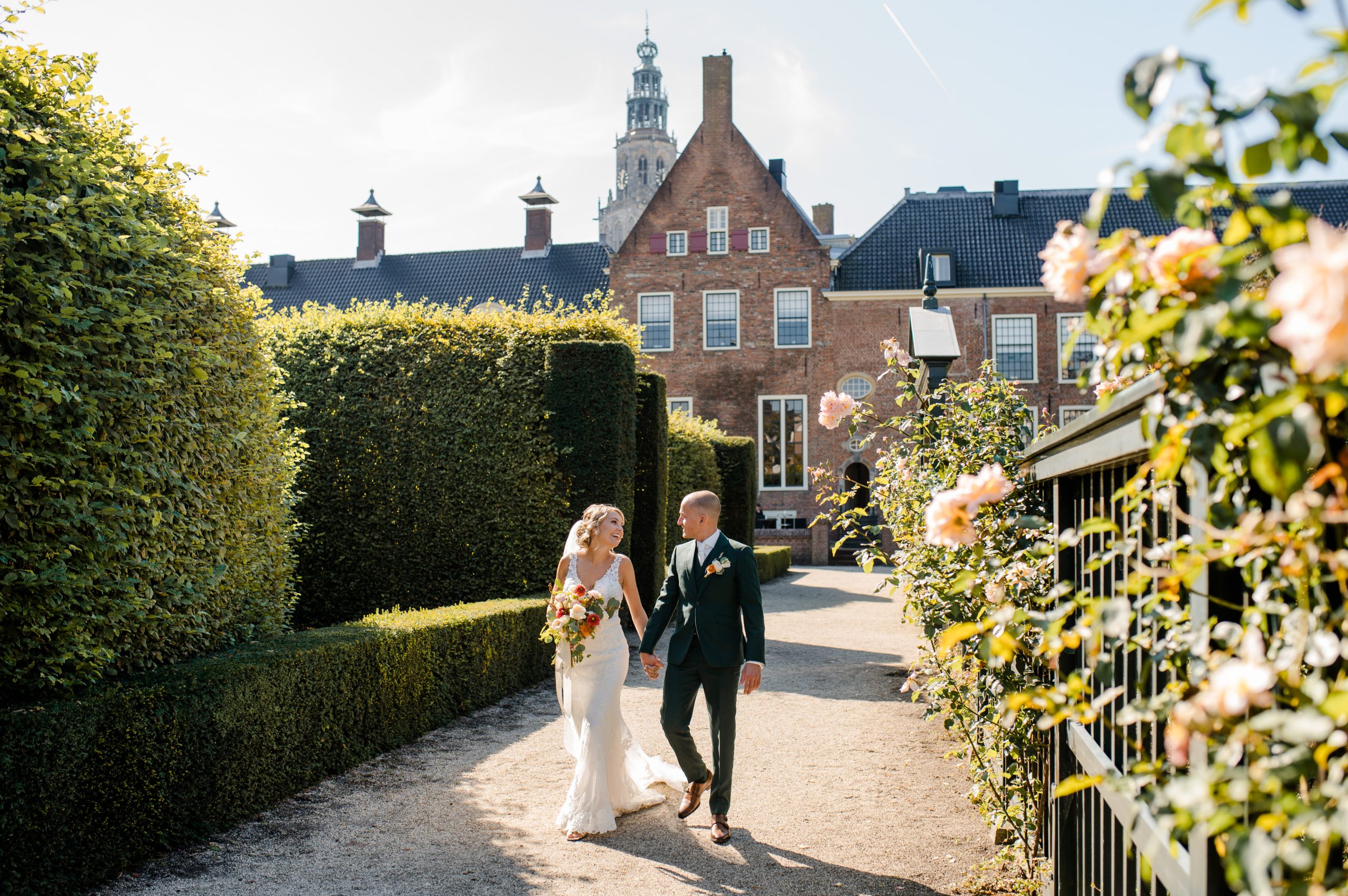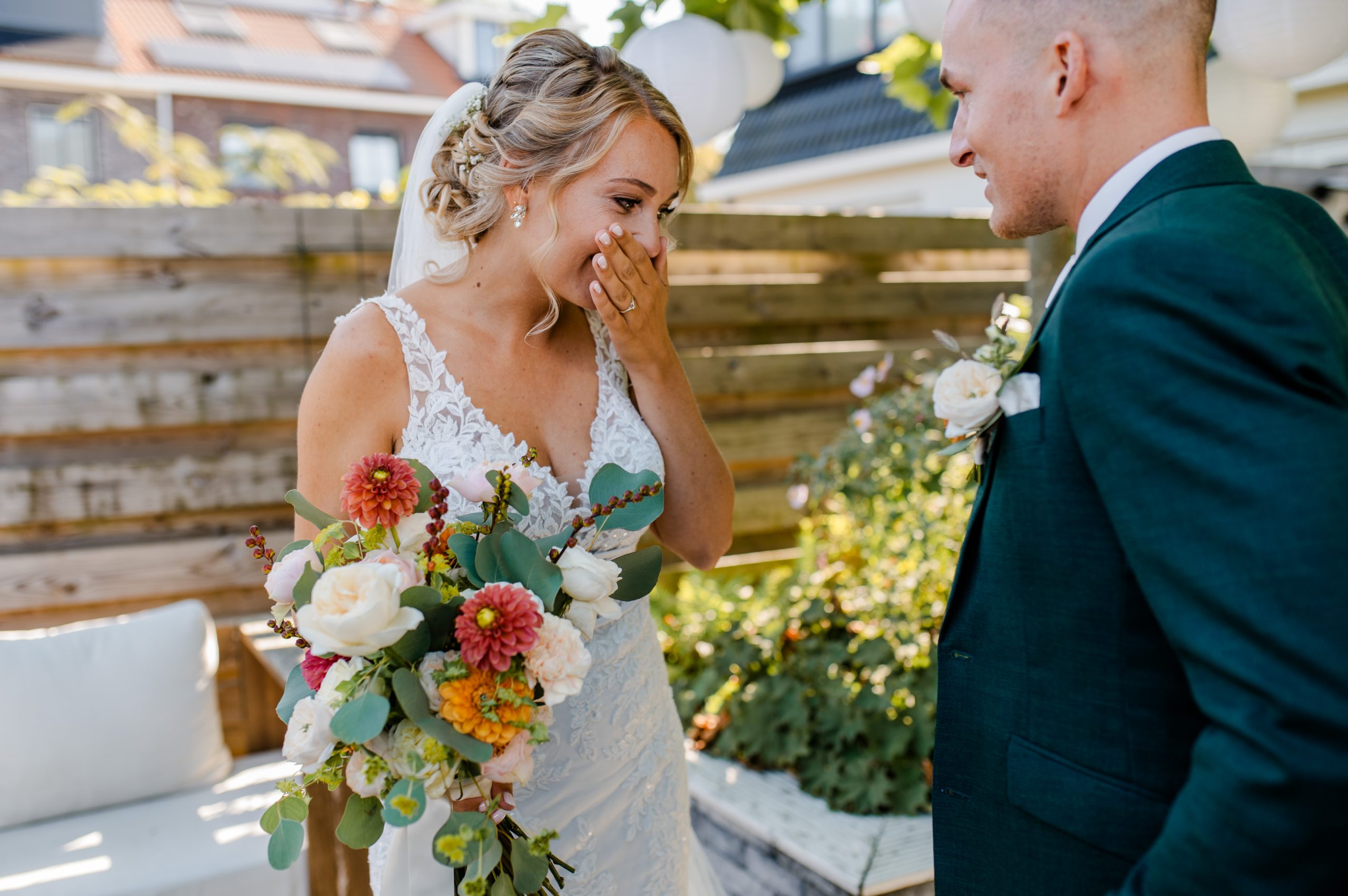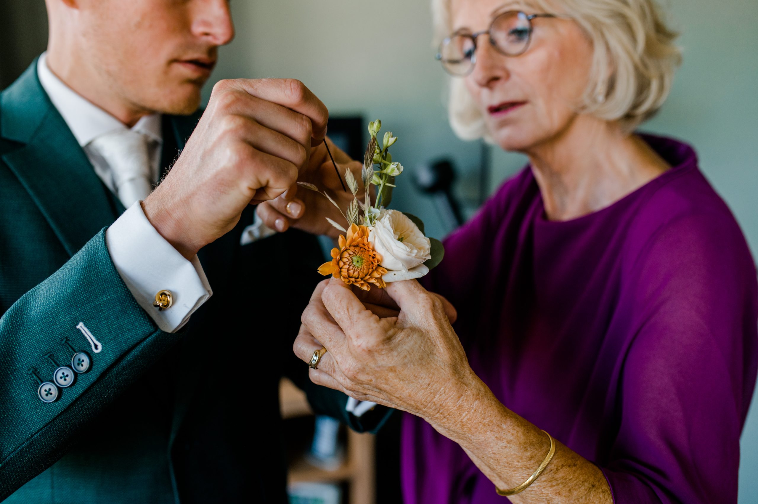 En toen brak de dag aan waarop Richard en Evelien elkaar het ja-woord gaven. Een stralend bruidspaar, en niet alleen dankzij de prachtige jurk van Evelien. Ook Richard mocht er wezen, met zijn uniek samengestelde trouwpak van De Stijlmeester. Hij koos voor een groen linnen-look trouwkostuum. Deze speciale stof heeft de losse uitstraling van linnen maar dan zonder de kreukgevoeligheid. Mooi zeg!