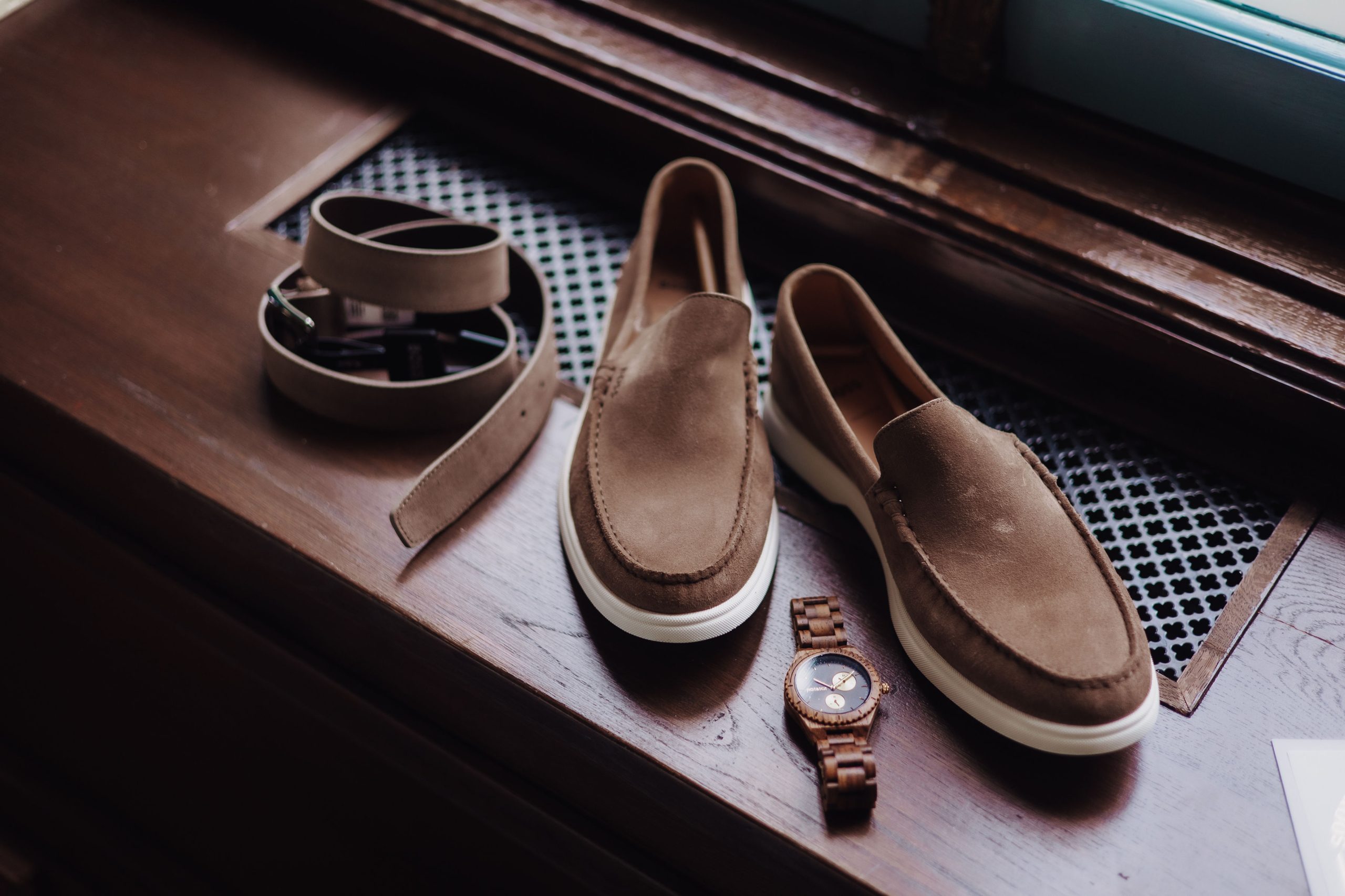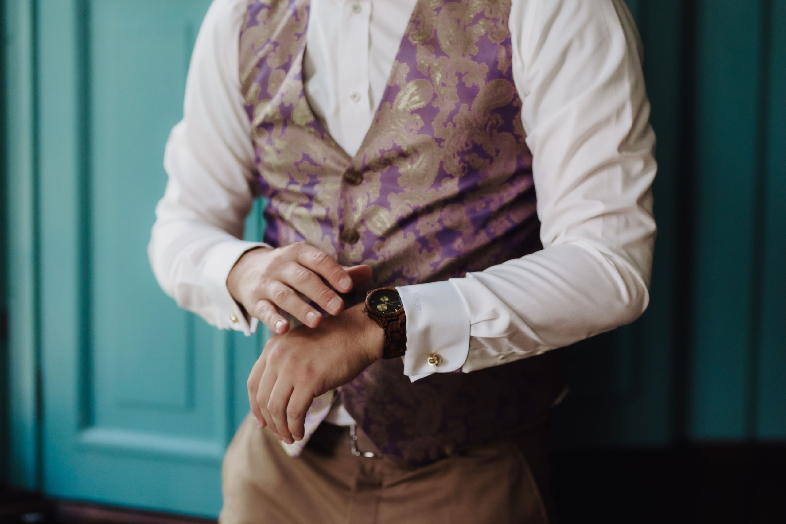 Lichtbruin beige trouwpak met paarse accenten