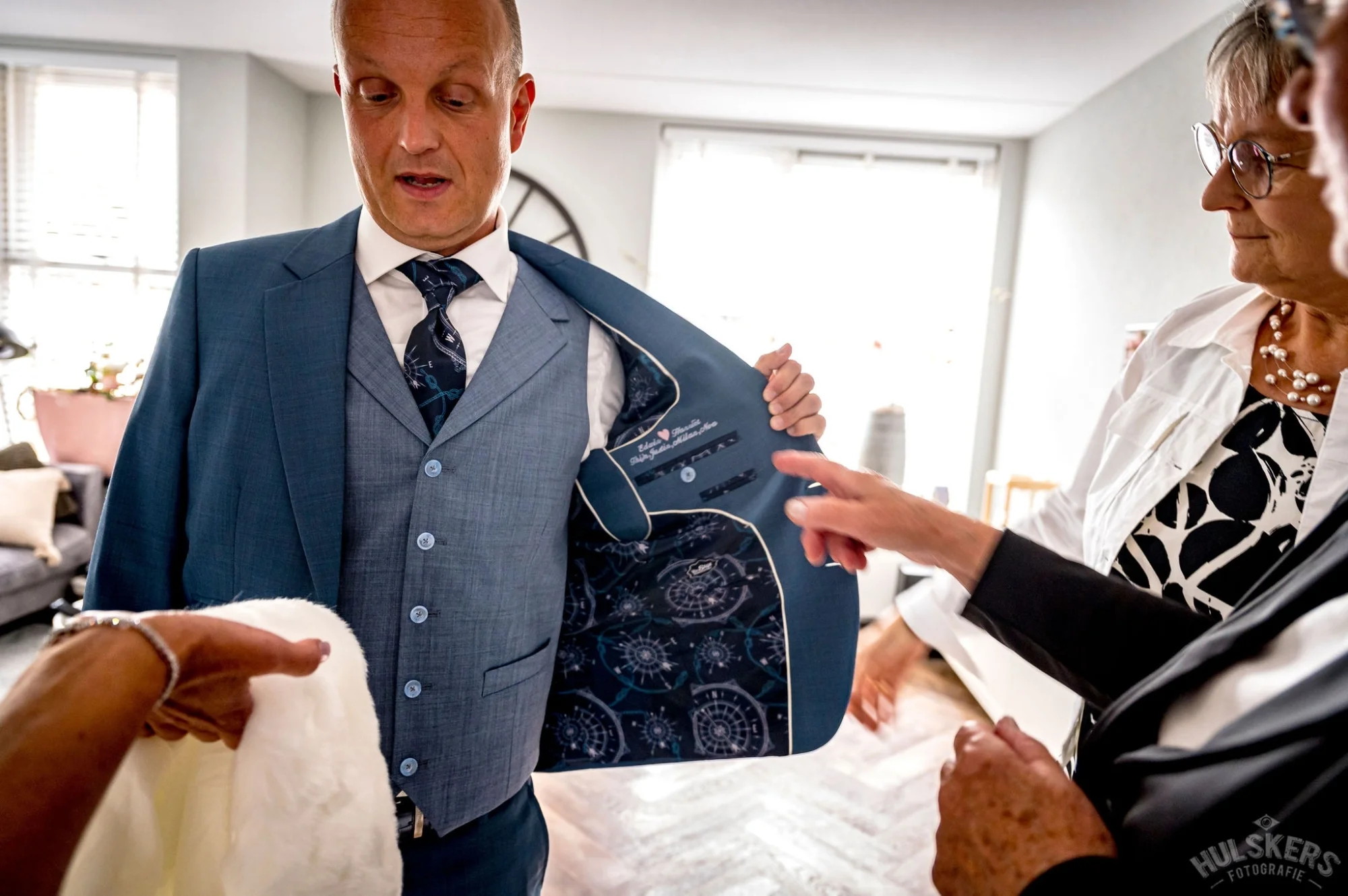 En, hoe leuk is dat, laat in je jasje een persoonlijke tekst of afbeelding borduren. Open je jasje en laat ze kijken: je zult anderen verbazen over de prachtige uitwerking van de mooie voeringen die wij in huis hebben. Maak het zo nog specialer. Je ziet aan bruidegom Edwin wat een uniek maatpak met je doet. Je straalt ervan. Oost west, voel je thuis en op je best.