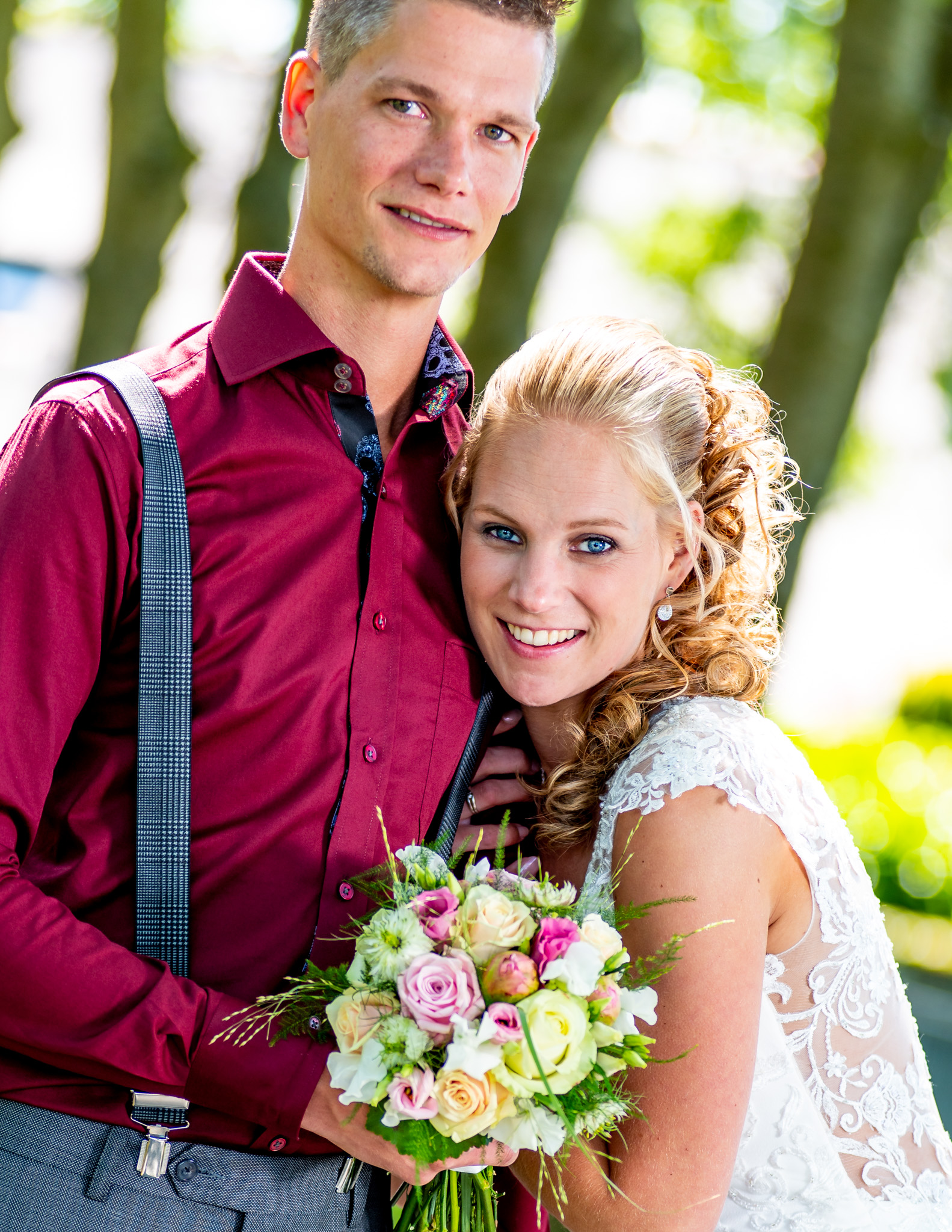 We stellen een prachtig trouwkostuum met je samen, in een stof, patroon en kleur die bij je past. Misschien heb je wel een lapje van de stof van de trouwjurk bij je, zodat we daar ook bij aan kunnen sluiten. Maar heel graag gaan we daarna nog een stapje verder. We vragen je of je extra stof wilt bestellen voor de corsages, het bloemenlint of het ringkussen.