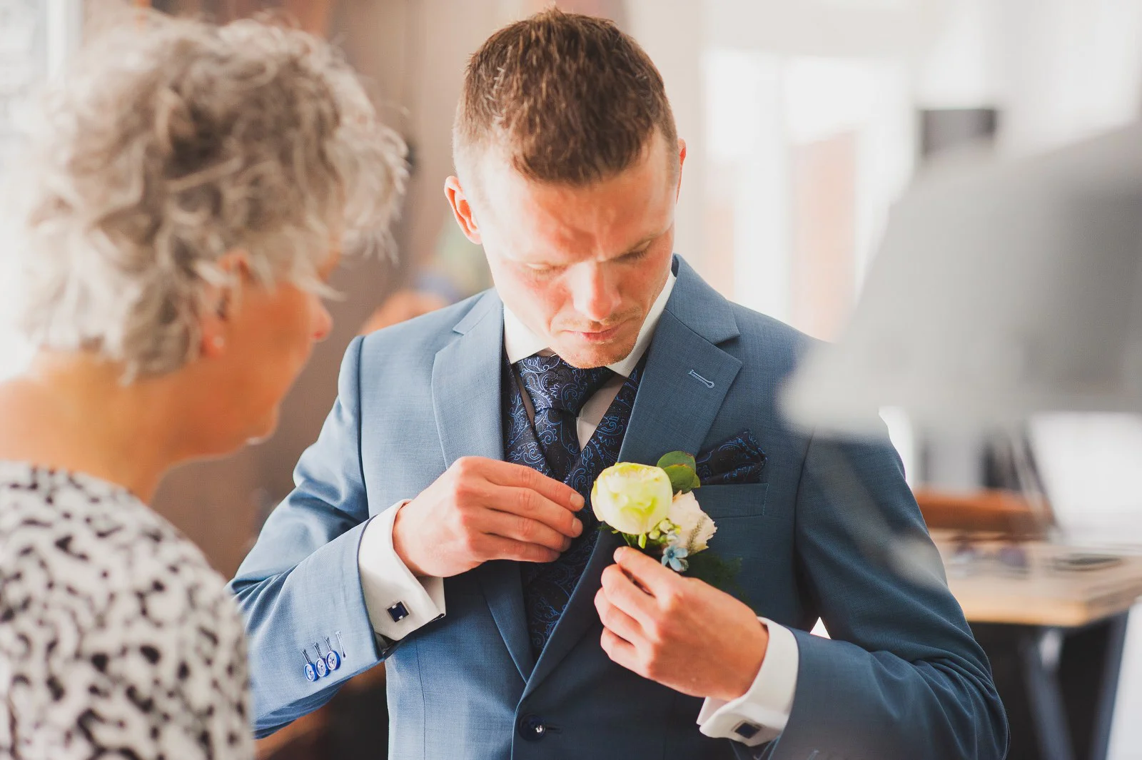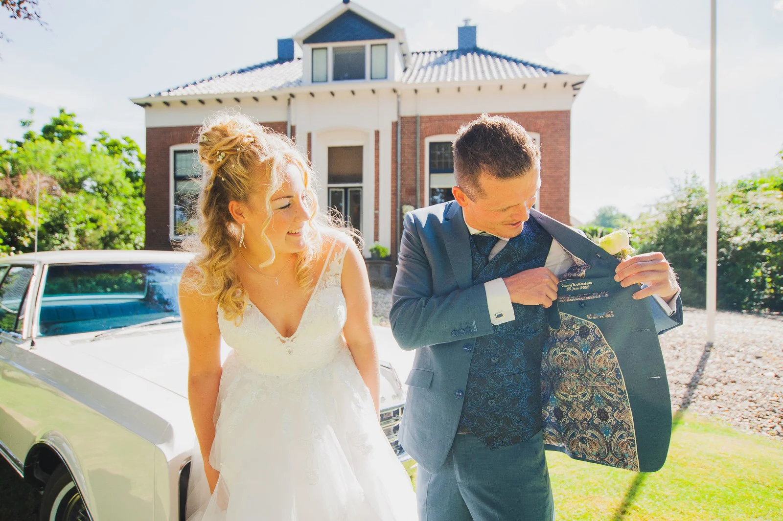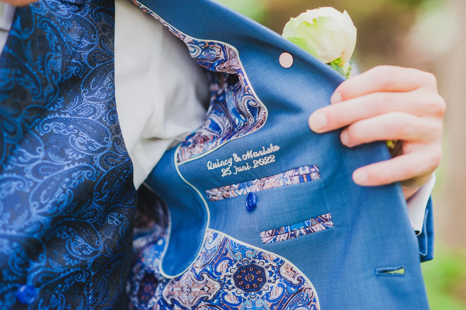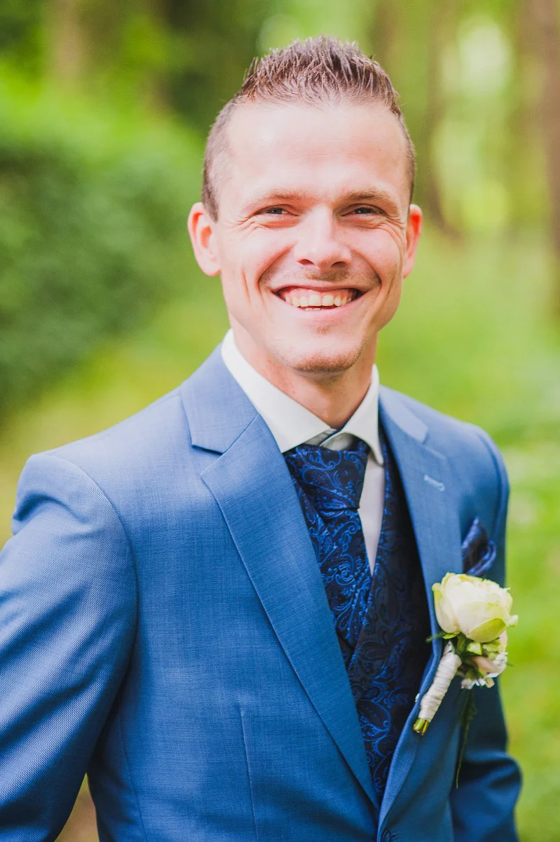 Bruidegom Quincy koos een blauw trouwpak, met een vestje in chique blauwe jacquardstof op de voorkant. We lieten de stropdas weer in dezelfde stof maken, alles voor de mooiste match.