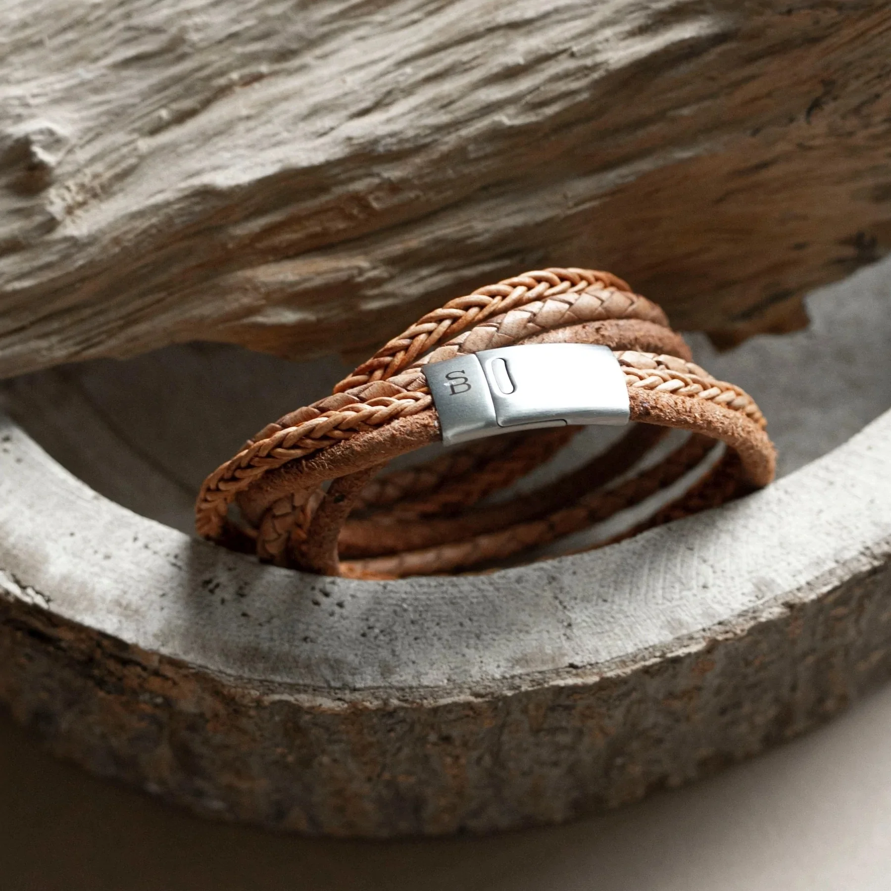 Een leren wikkelarmband voor heren. De Bonacci armband bestaat uit drie leren koorden van topkwaliteit. Een vintage rond leren koord, een gevlochten koord en een 8 strengen koord.