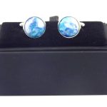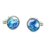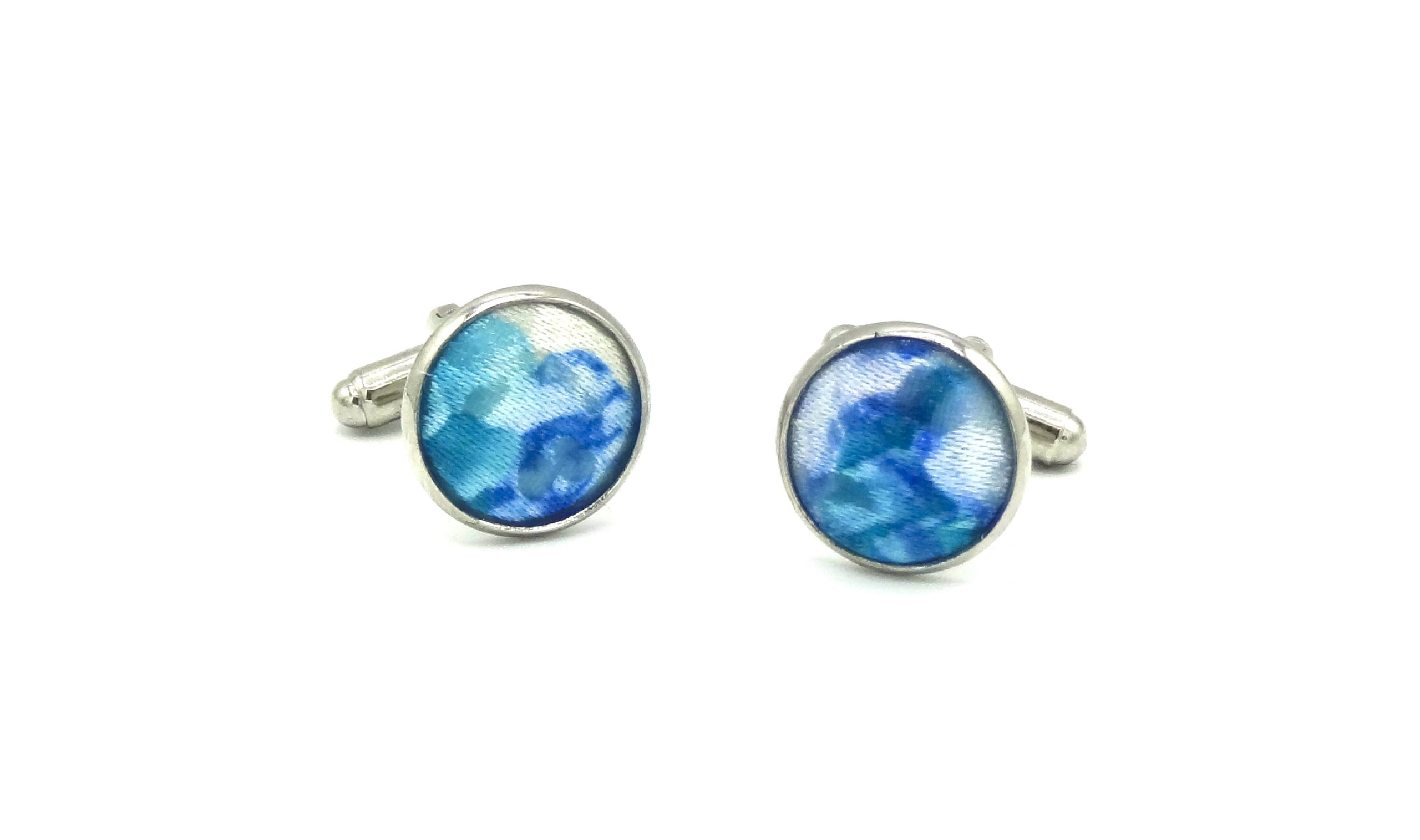 Een prachtig blauw gebloemd stukje stof siert deze ronde manchetknopen.