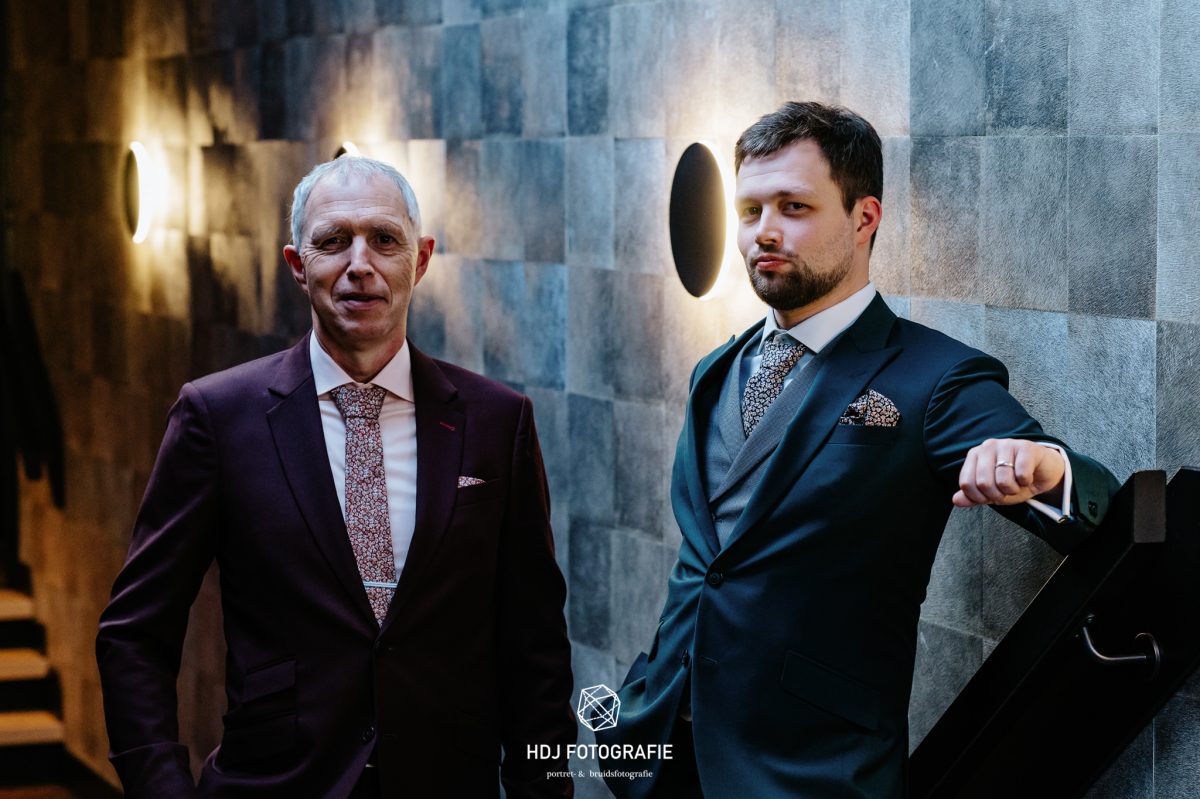 Krijno en Arnold dragen in de winkel altijd een driedelig kostuum. Zo kun jij zien hoe persoonlijk het te maken is. En als het vest ter sprake komt, doen ze allebei hun jasje open. De een draagt een gilet met enkele knoop zonder revers, de ander een double-breasted (twee rijen knopen) gilet mét revers. De meeste bruidegoms kiezen die laatste versie. Ze willen echt uitpakken, en dat is terecht. En, leuk feitje: in de ‘gewone pakkenwinkels’ kun je alleen de standaardversie met 1 rij knopen krijgen.