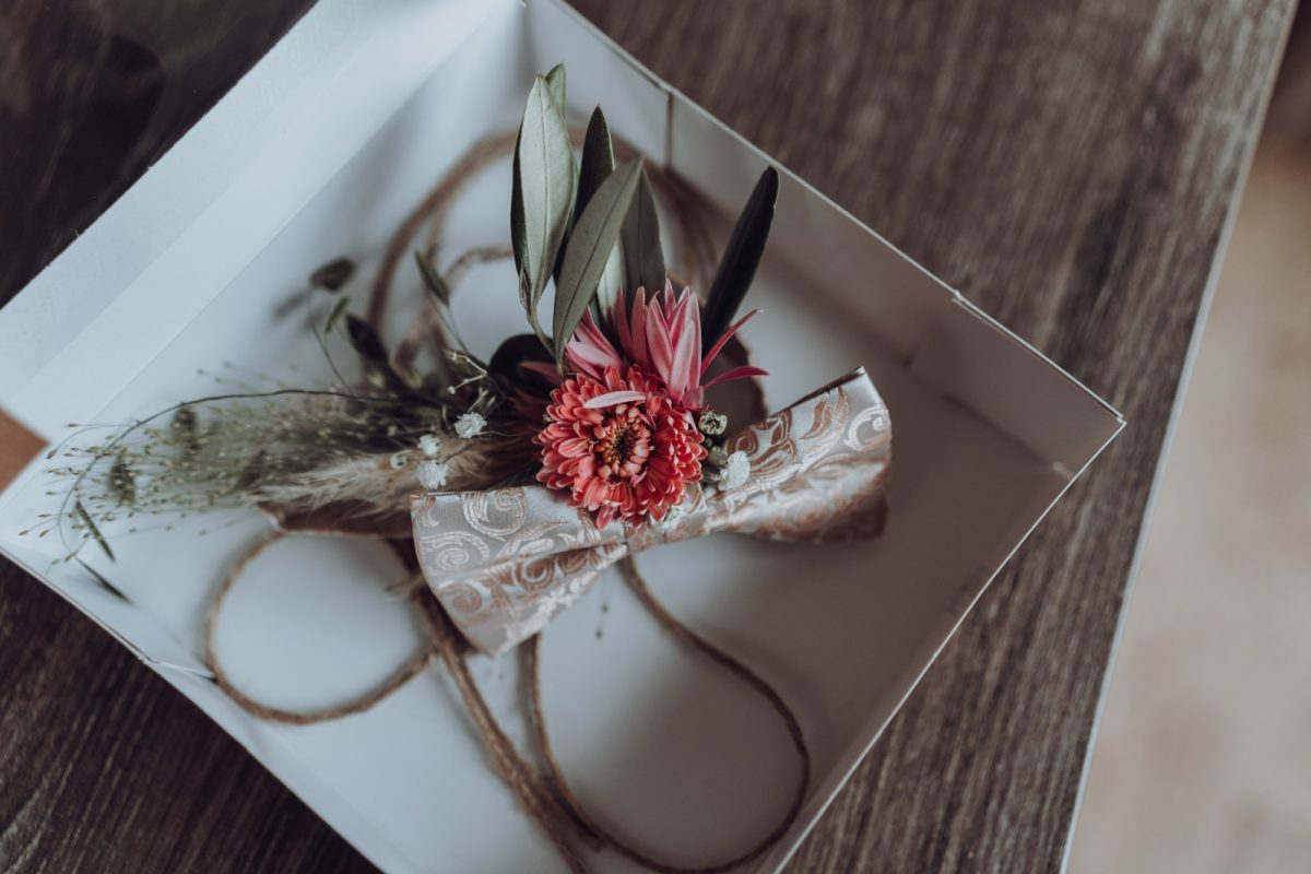 Het omwikkelen van het trouwboeket, het naaien van een ringenkussen of het maken van speciale corsages met stof van je trouwkostuum is ook een leuke tip. Zo maak je er een mooie eenheid van. En jullie zijn het middelpunt!